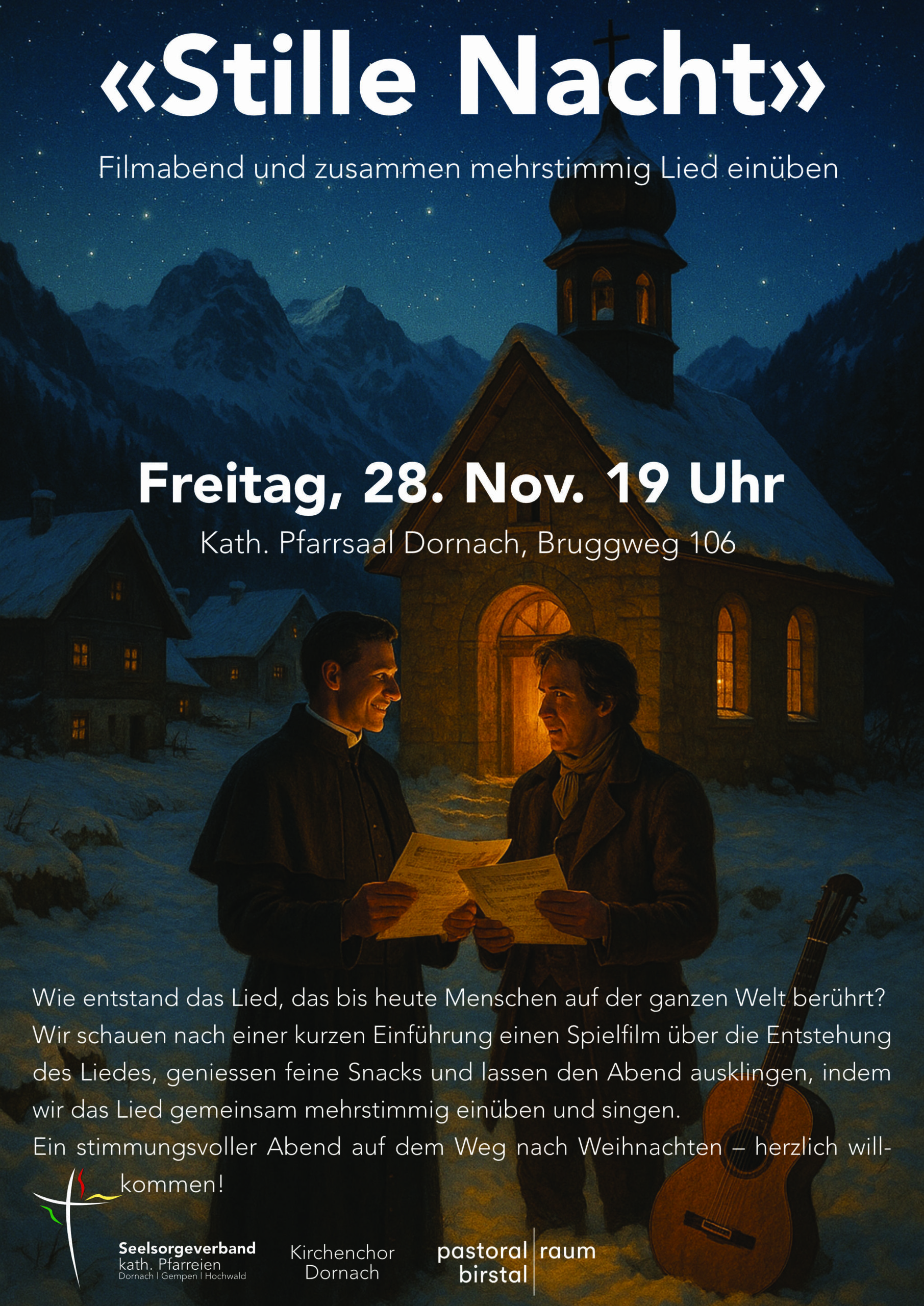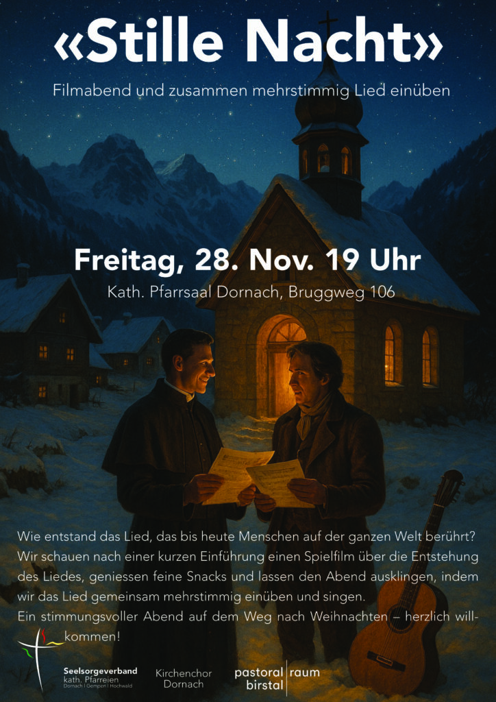 Wir schauen nach einer kurzen Einführung einen Spielfilm über die Entstehung des Liedes, geniessen feine Snacks und lassen den Abend ausklingen, indem wir das Lied gemeinsam mehrstimmig einüben und singen.