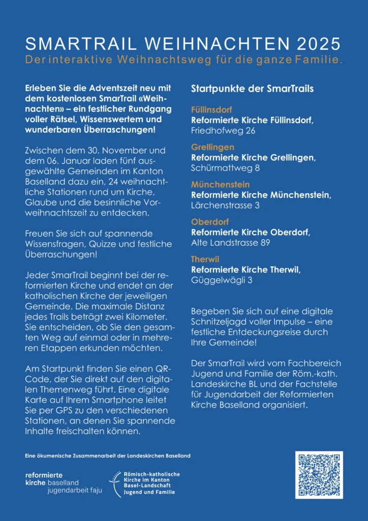 Zwischen dem 01. Dezember 2025 und dem 06. Januar 2026 laden fünf Gemeinden im Kanton Baselland dazu ein, 24 weihnachtliche Stationen rund um Kirche, Glaube und die besinnliche Vorweihnachtszeit zu entdecken. Auf Gross, Klein und Familien warten spannende Wissensfragen, humorvolle Beiträge, Tiefgründiges, Besinnliches und festliche Überraschungen!